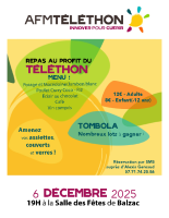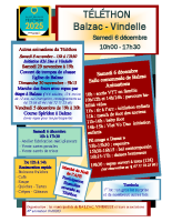 Cette année, le Téléthon, organisé par les communes de Balzac, Vindelle et leurs associations se déroulera le 6 décembre à partir de 10h, salle communale de Balzac.